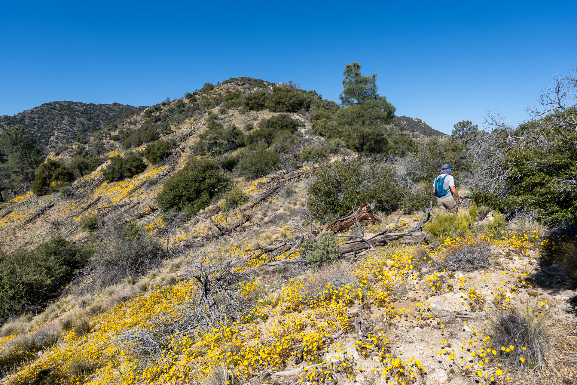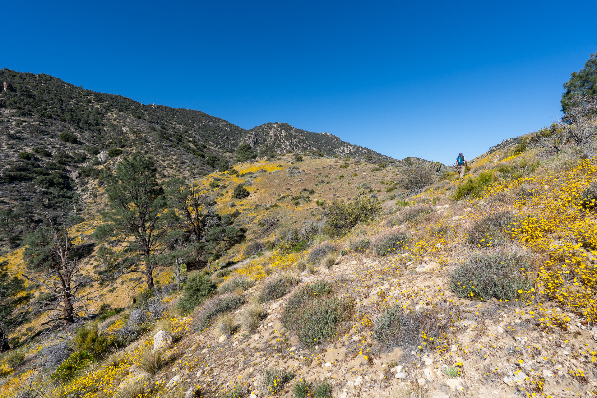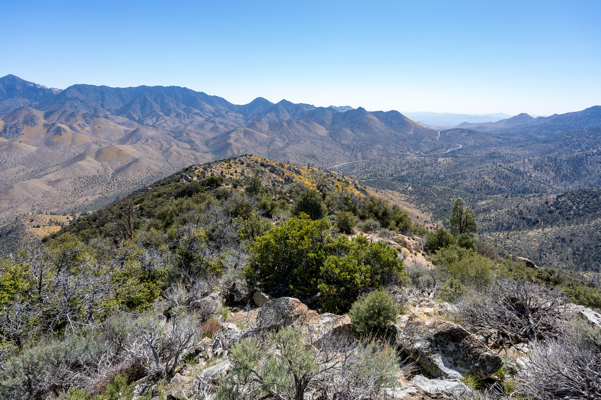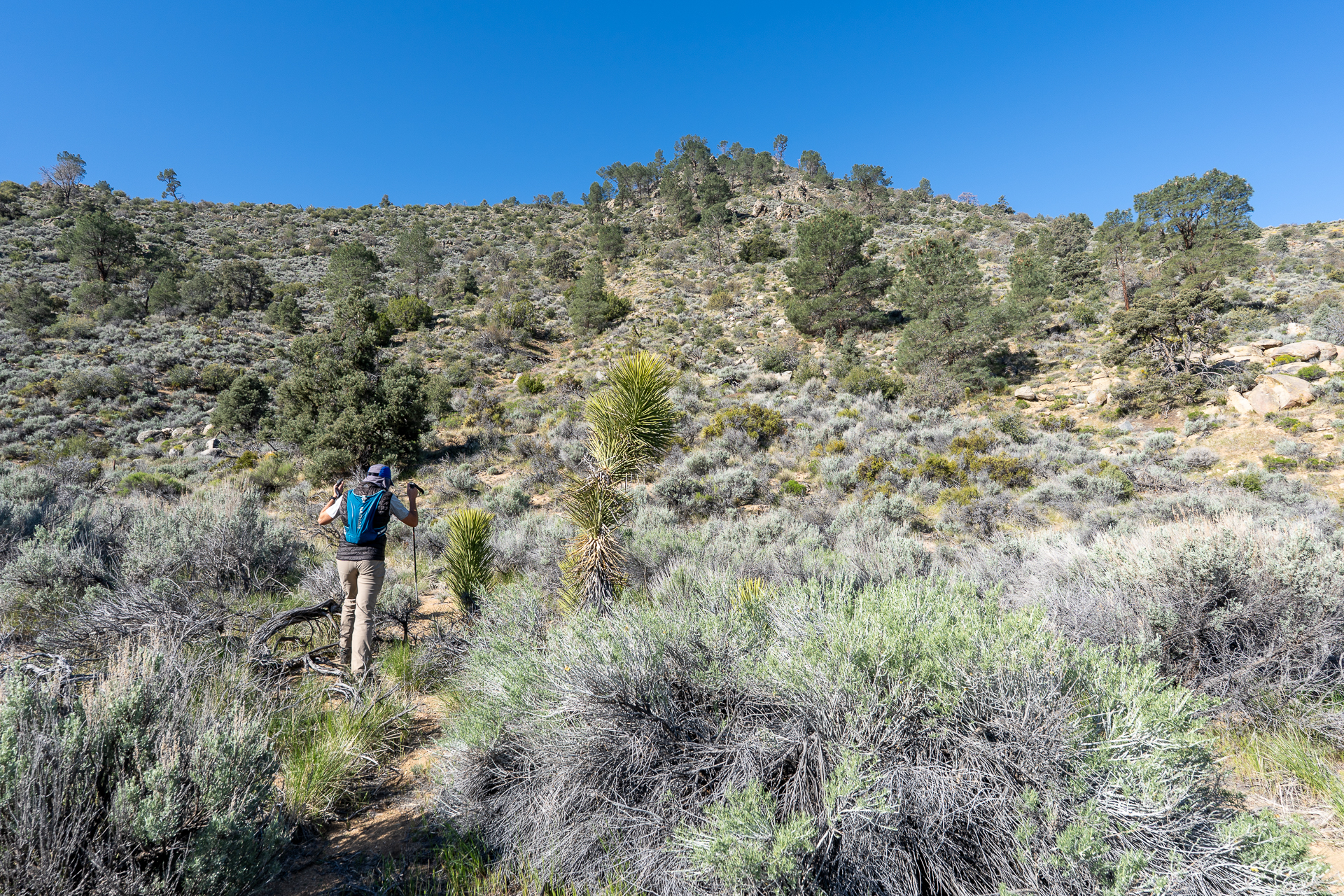 Starting up a steep slope from Walker Pass Road.View back.Contouring a small prominence. Wildflowers abundant.Approaching a steep, 900-foot slope.Gaining an eastern spur of Pinyon Peak.View north toward a colorful, unnamed peak (Peak 5797).View back toward Walker Pass (right).Pinyon Peak's summit comes into view (left).Navigating deadfall and brush.Contouring toward Pinyon Peak's forested northern slope.Easy grade near the summit.View back toward Owens Peak (left of center).Pinyon Peak summit.View southeast. Scodie Mountain is on the right.View south across a plateau within the Kiavah Wilderness.
