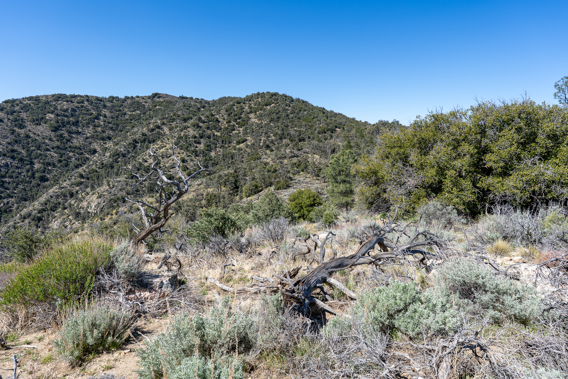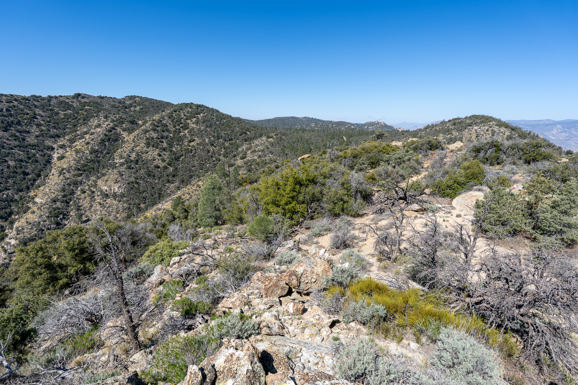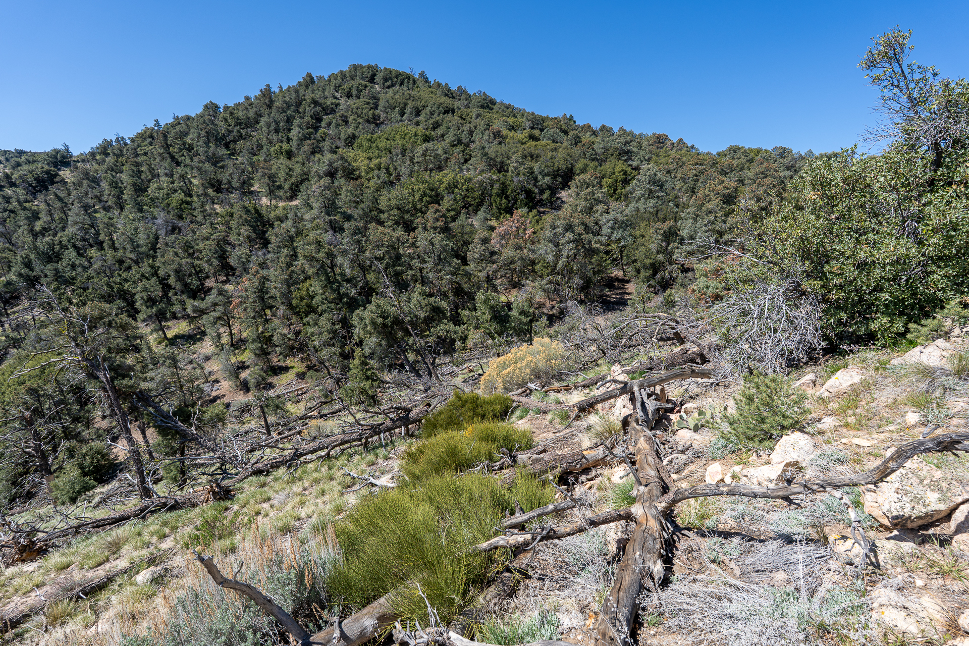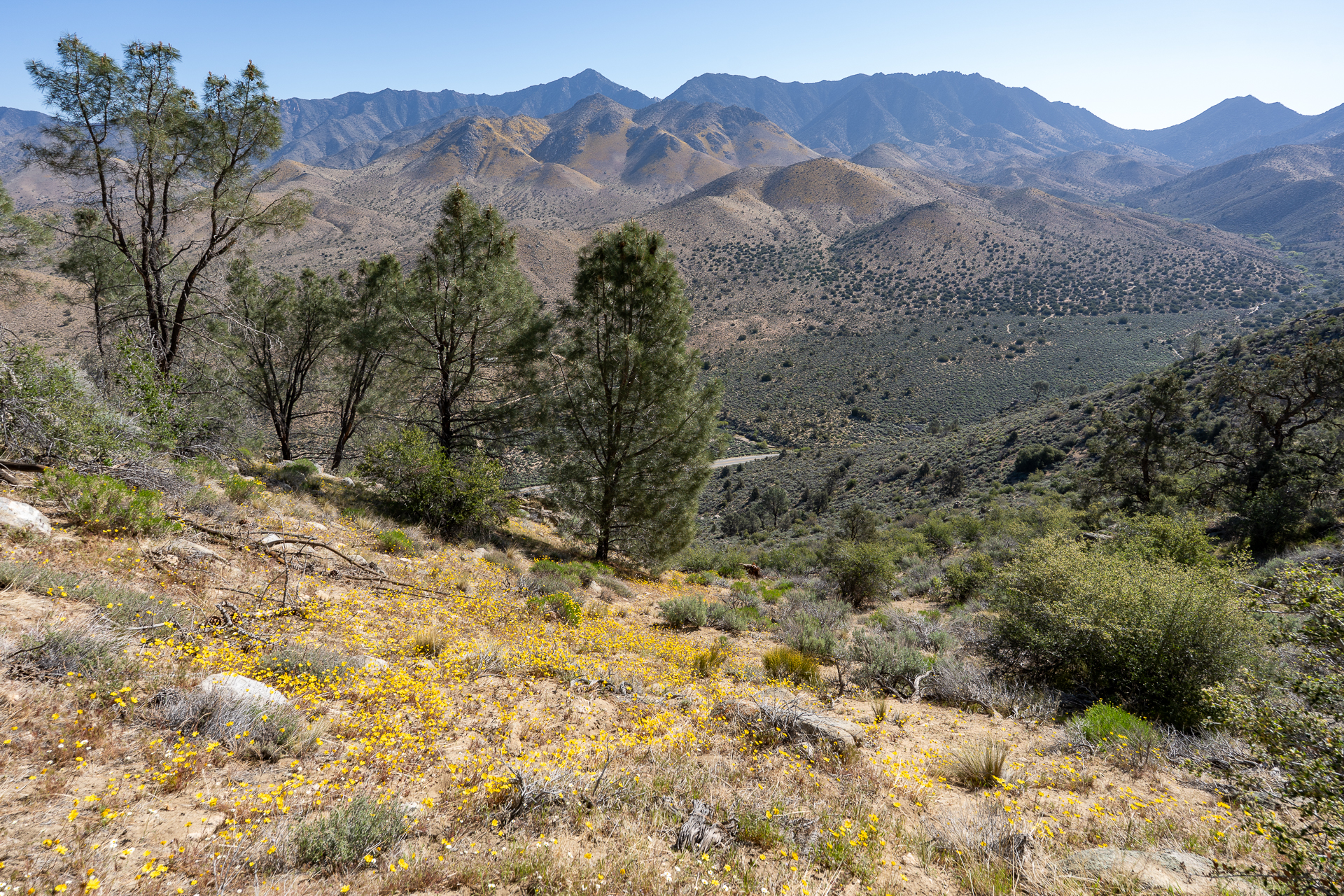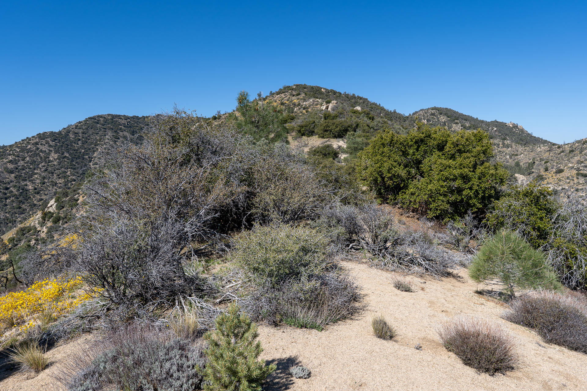 Starting up a steep slope from Walker Pass Road.View back.Contouring a small prominence. Wildflowers abundant.Approaching a steep, 900-foot slope.Gaining an eastern spur of Pinyon Peak.View north toward a colorful, unnamed peak (Peak 5797).View back toward Walker Pass (right).Pinyon Peak's summit comes into view (left).Navigating deadfall and brush.Contouring toward Pinyon Peak's forested northern slope.Easy grade near the summit.View back toward Owens Peak (left of center).Pinyon Peak summit.View southeast. Scodie Mountain is on the right.View south across a plateau within the Kiavah Wilderness.