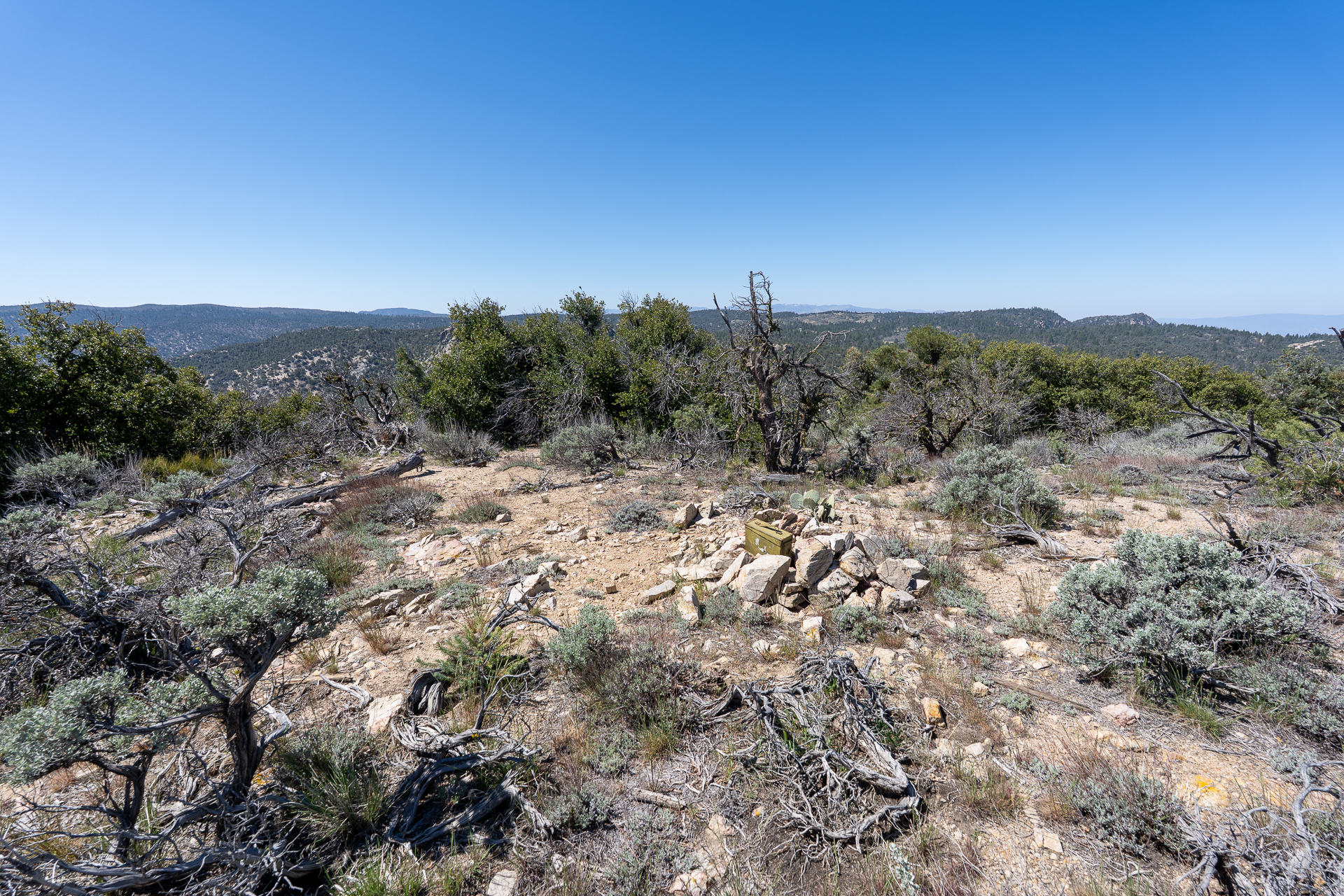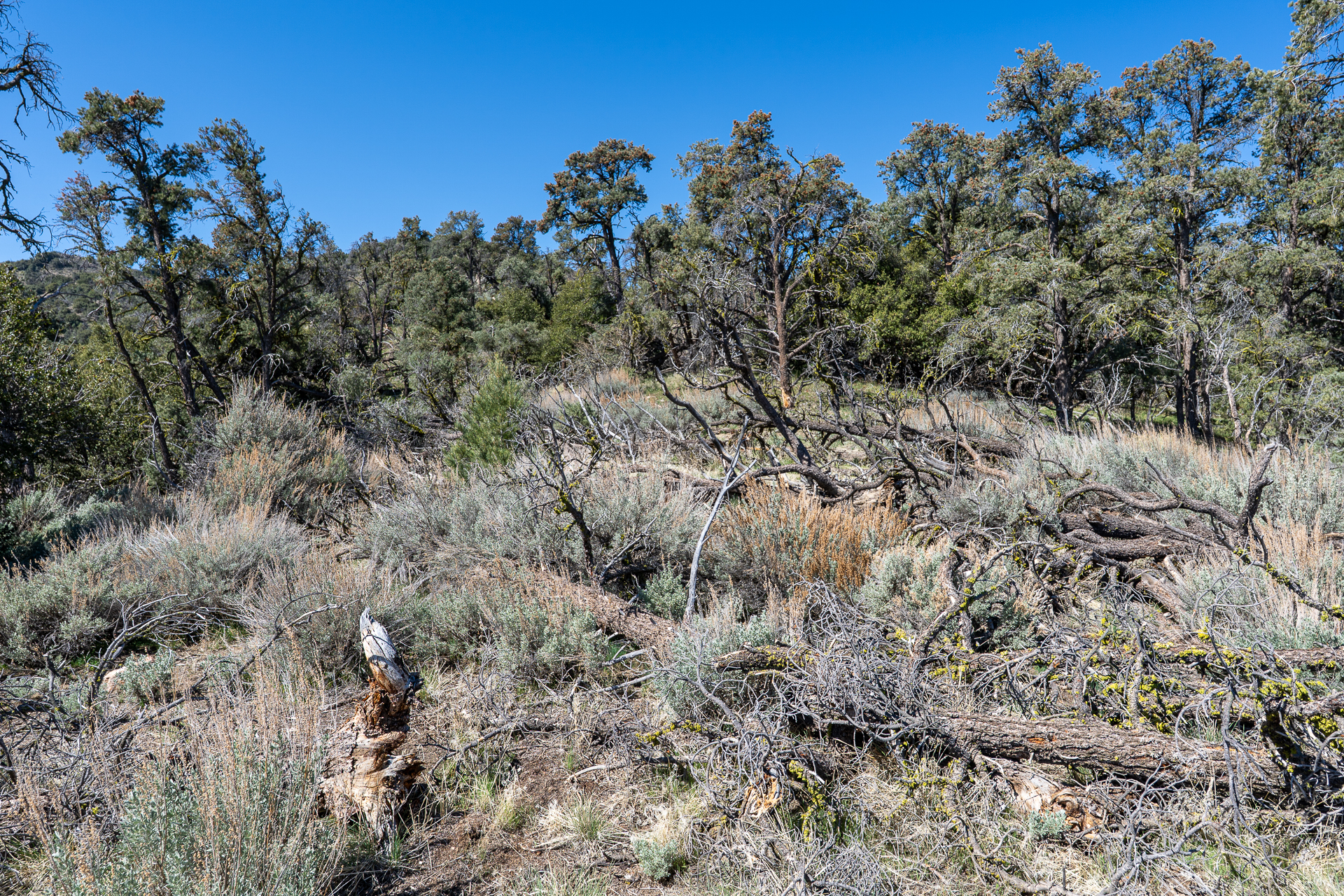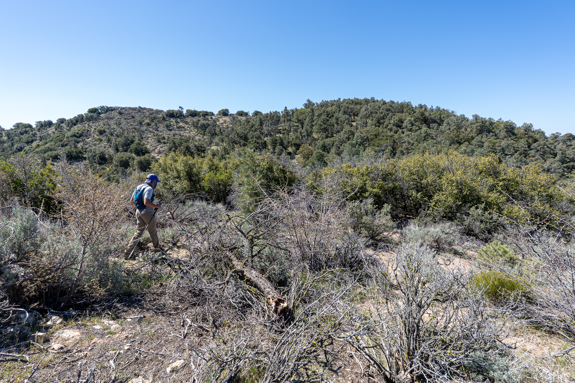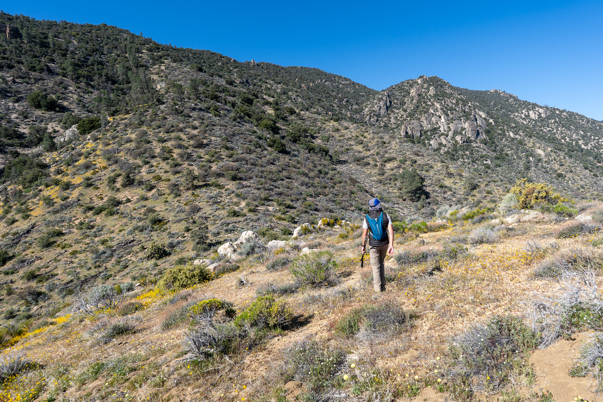 Starting up a steep slope from Walker Pass Road.View back.Contouring a small prominence. Wildflowers abundant.Approaching a steep, 900-foot slope.Gaining an eastern spur of Pinyon Peak.View north toward a colorful, unnamed peak (Peak 5797).View back toward Walker Pass (right).Pinyon Peak's summit comes into view (left).Navigating deadfall and brush.Contouring toward Pinyon Peak's forested northern slope.Easy grade near the summit.View back toward Owens Peak (left of center).Pinyon Peak summit.View southeast. Scodie Mountain is on the right.View south across a plateau within the Kiavah Wilderness.
