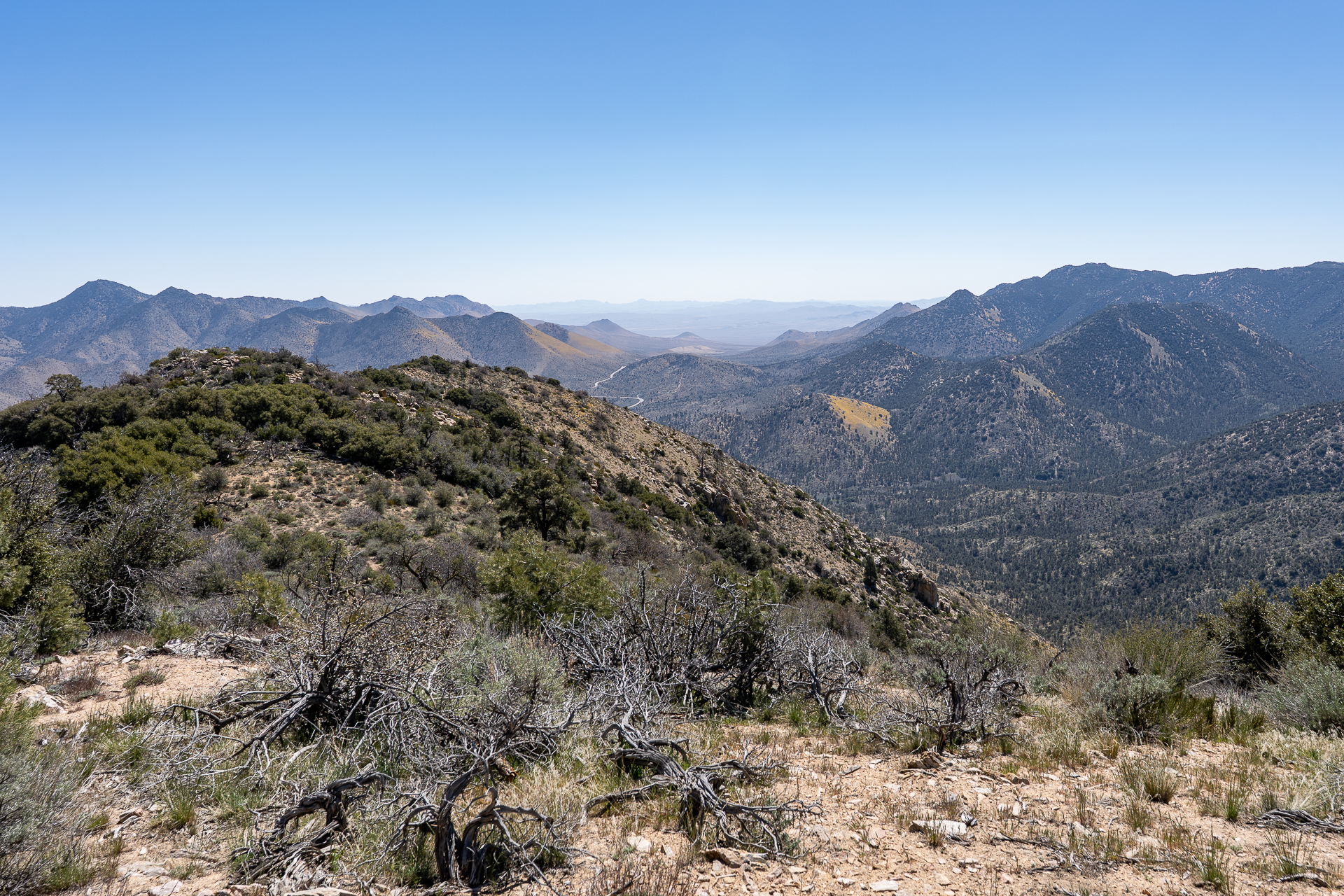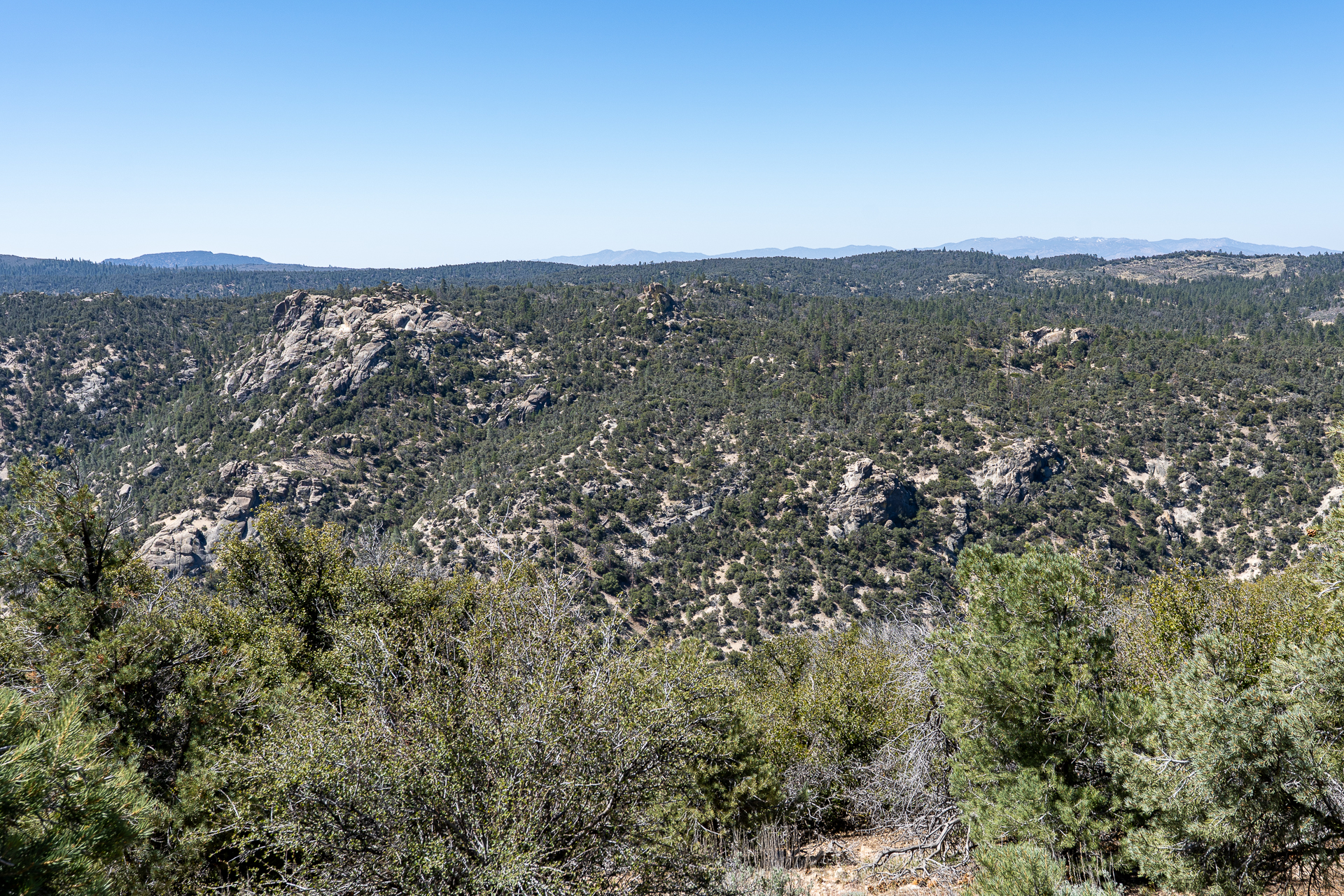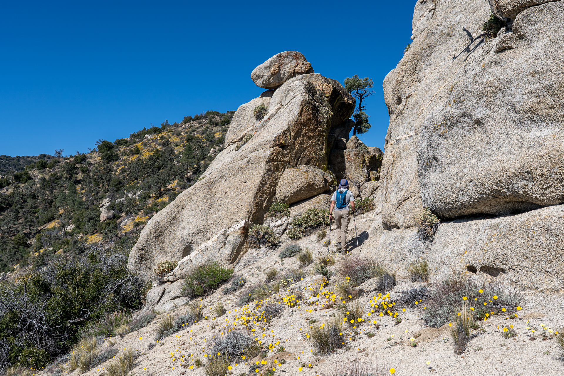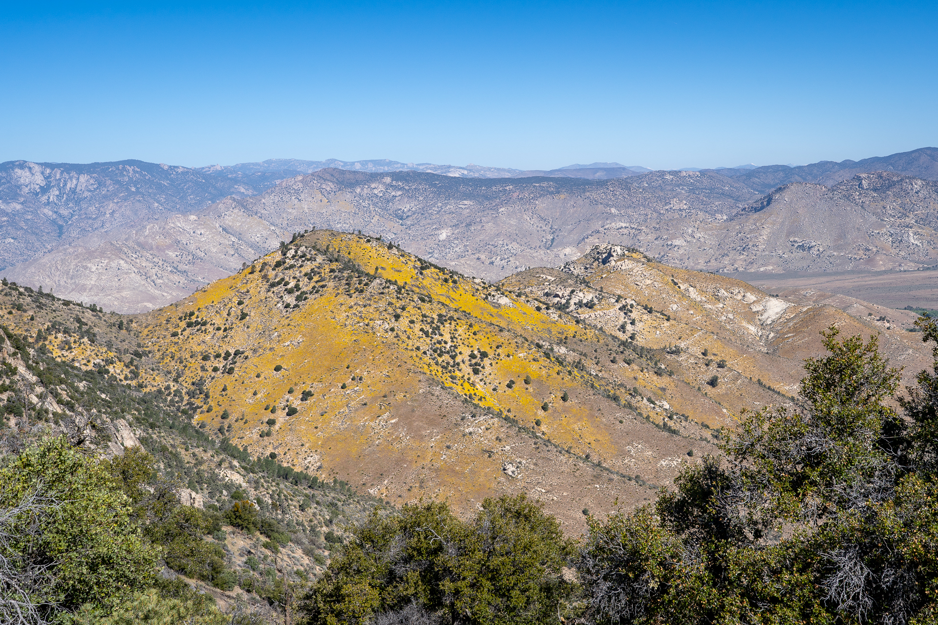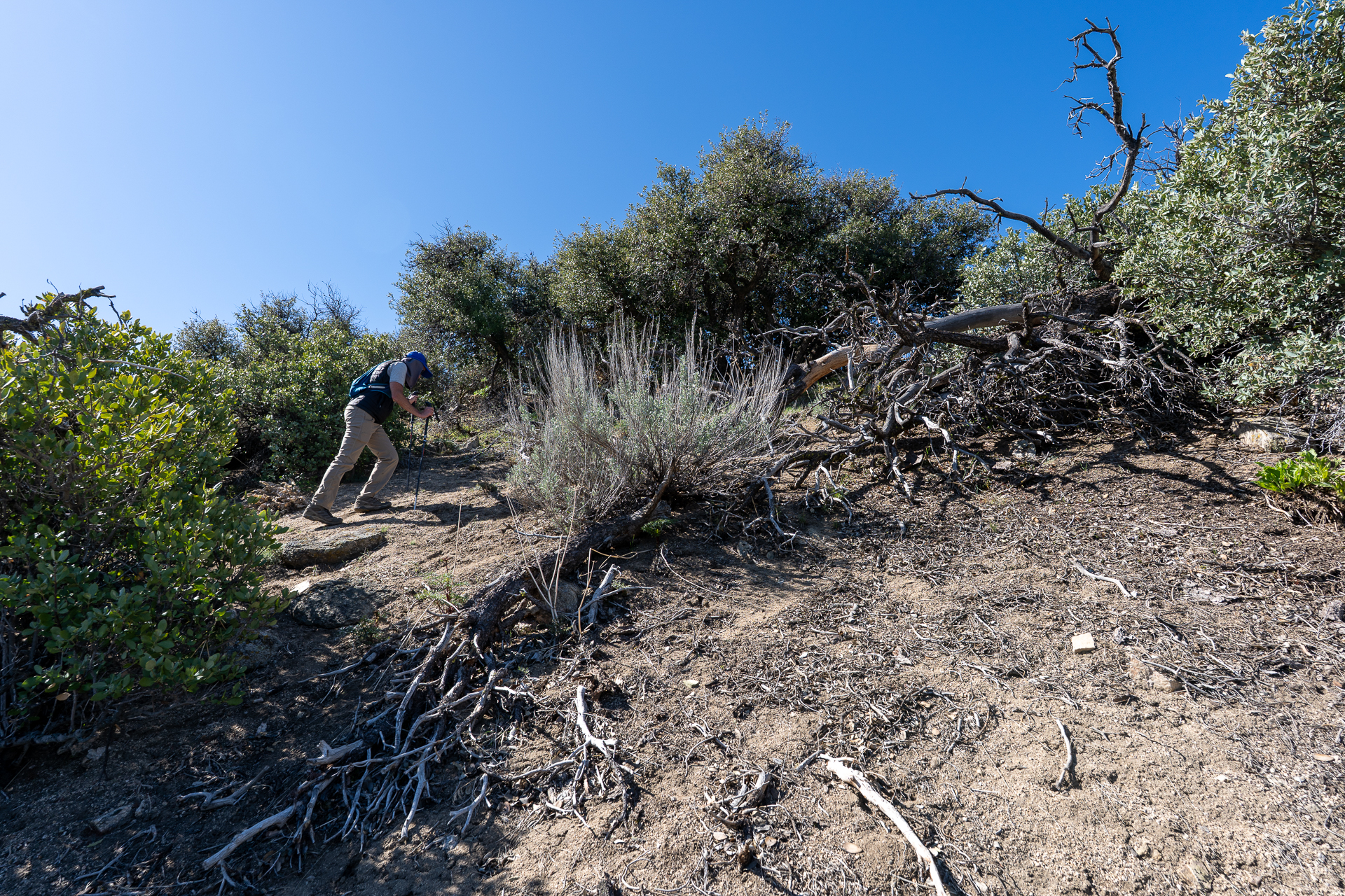 Starting up a steep slope from Walker Pass Road.View back.Contouring a small prominence. Wildflowers abundant.Approaching a steep, 900-foot slope.Gaining an eastern spur of Pinyon Peak.View north toward a colorful, unnamed peak (Peak 5797).View back toward Walker Pass (right).Pinyon Peak's summit comes into view (left).Navigating deadfall and brush.Contouring toward Pinyon Peak's forested northern slope.Easy grade near the summit.View back toward Owens Peak (left of center).Pinyon Peak summit.View southeast. Scodie Mountain is on the right.View south across a plateau within the Kiavah Wilderness.